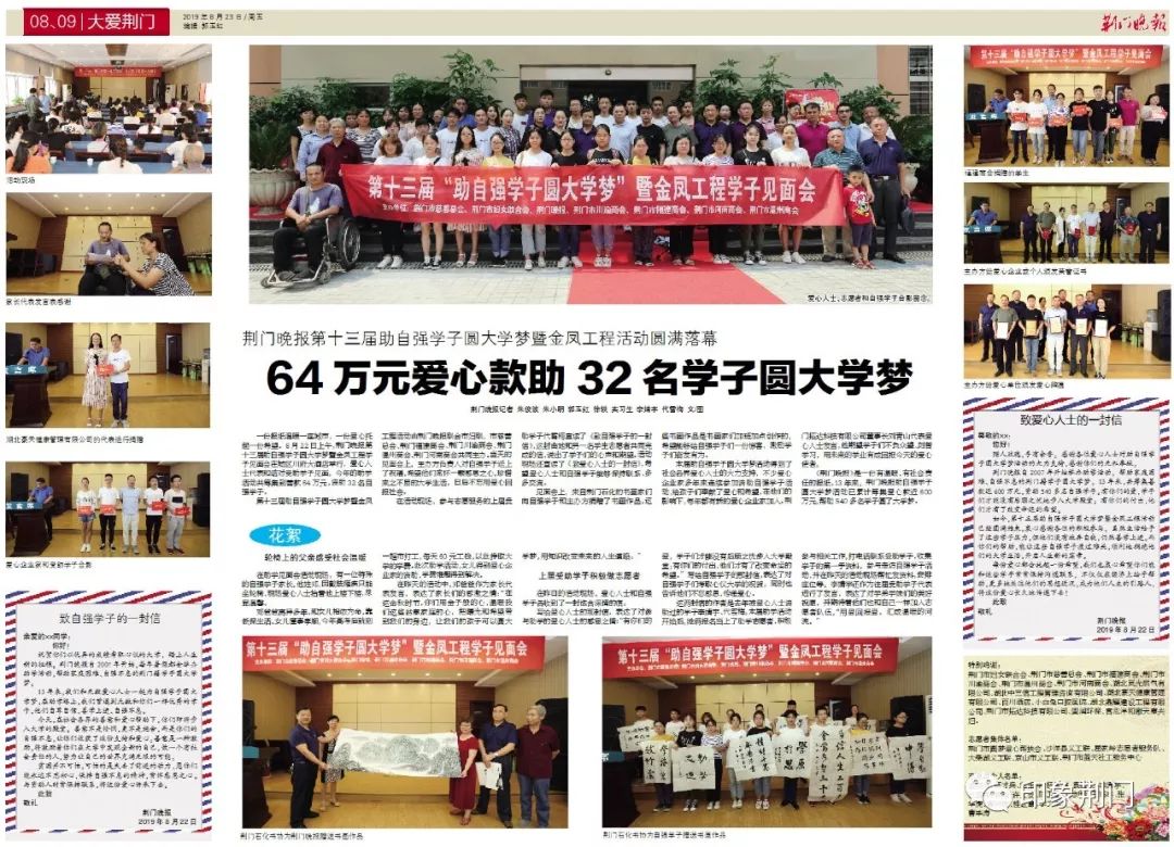 《荊門晚報》是一份有溫暖、有社會責任的報紙,13年來,荊門晚報助自強學子圓大學夢活動已累計籌集愛心款近600萬元,幫助540多名學子圓了大學夢。