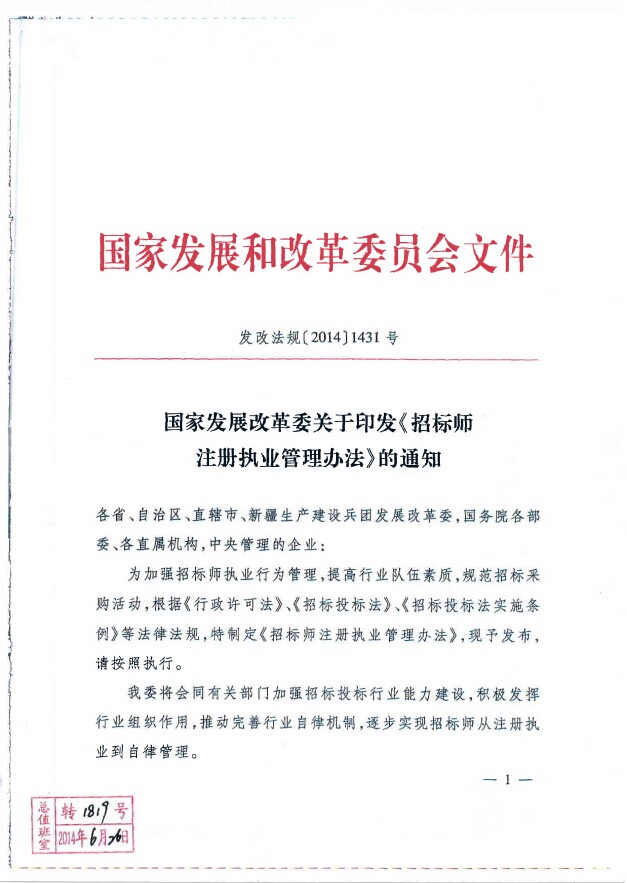 國(guó)家發(fā)展改革委關(guān)于印發(fā)《招標(biāo)師注冊(cè)執(zhí)業(yè)管理辦法》的通知(發(fā)改法