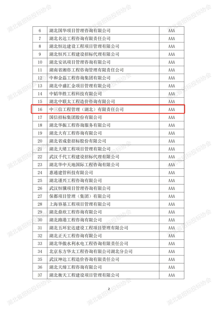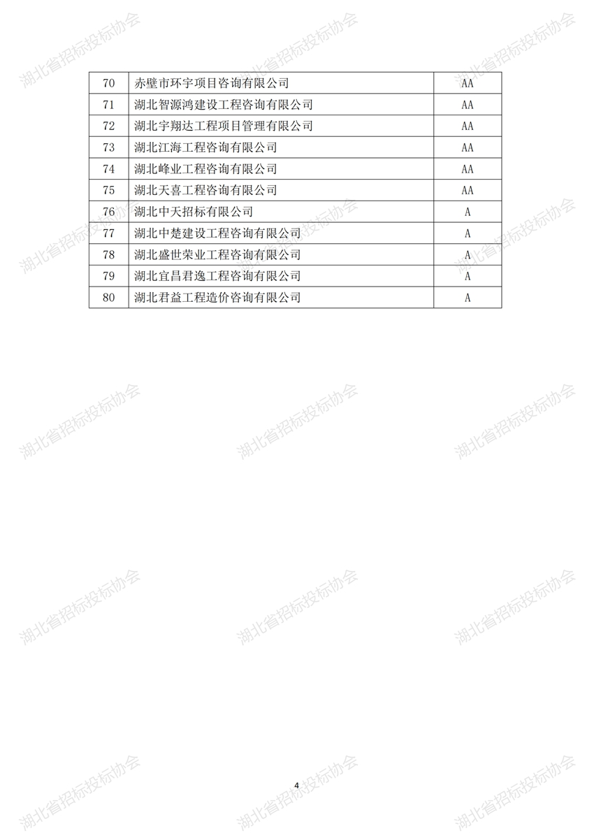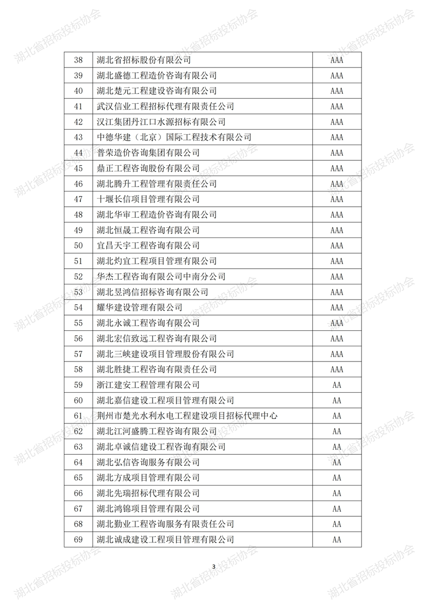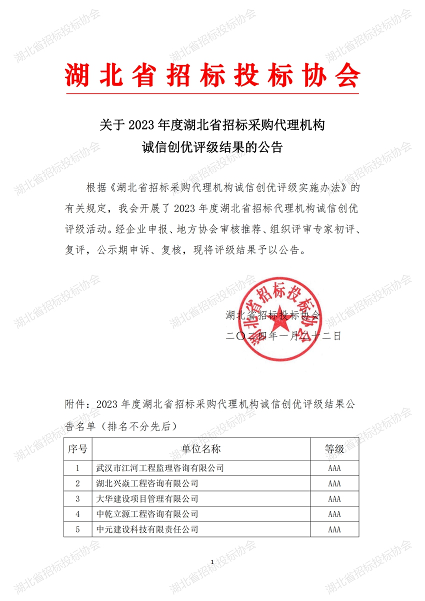根據(jù)《湖北省招標(biāo)采購(gòu)代理機(jī)構(gòu)誠(chéng)信創(chuàng)優(yōu)評(píng)級(jí)實(shí)施辦法》的有關(guān)規(guī)定,我會(huì)開(kāi)展了2023年度湖北省招標(biāo)代理機(jī)構(gòu)誠(chéng)信創(chuàng)優(yōu)評(píng)級(jí)活動(dòng)。經(jīng)企業(yè)申報(bào)、地方協(xié)會(huì)審核推薦、組織評(píng)審專(zhuān)家初評(píng)、復(fù)評(píng),公示期申訴、復(fù)核,現(xiàn)將評(píng)級(jí)結(jié)果予以公告。